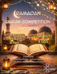 We are thrilled to announce the launch of the Quran Competition 📖 for Ramadan 1447/2026 . The competition is generously funded by Ahmed Khadadah’s Annual Holy Quran Award and Canterbury Mosque 🕌.