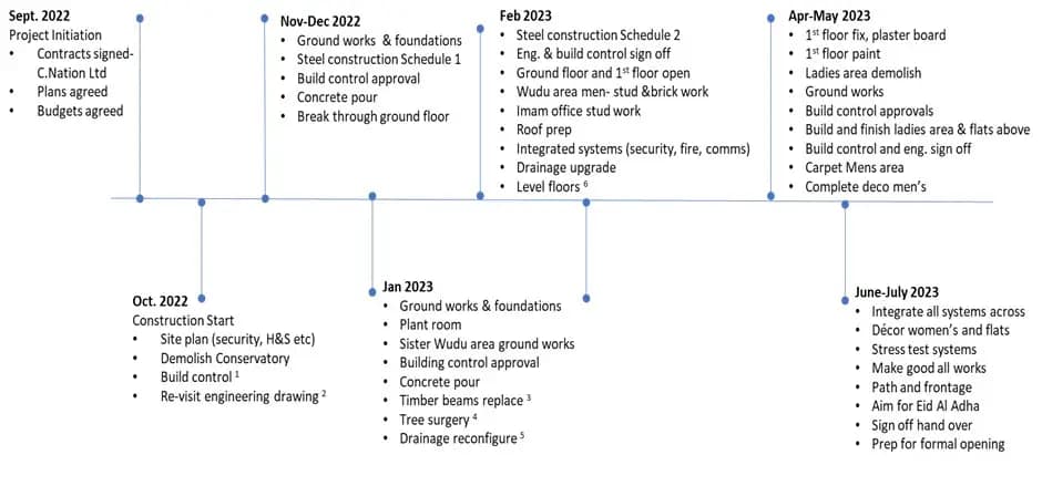 In September 2022, with your support and generosity the extension project (the Project) began with earnest.  Over the past months tremendous progress has been made, despite the challenges faced with new buildings regulations coming into force resulting in further engineering designs, upgrading foundations as well as unknown factors that occasionally come up and give us another reminder for example drainage issues and re-placing beams.  However, the project team and the contractors have been resilient and kept the project moving at pace. As of today, the roadmap below provides a guide of the key headlines of progress and anticipated completion of the project.